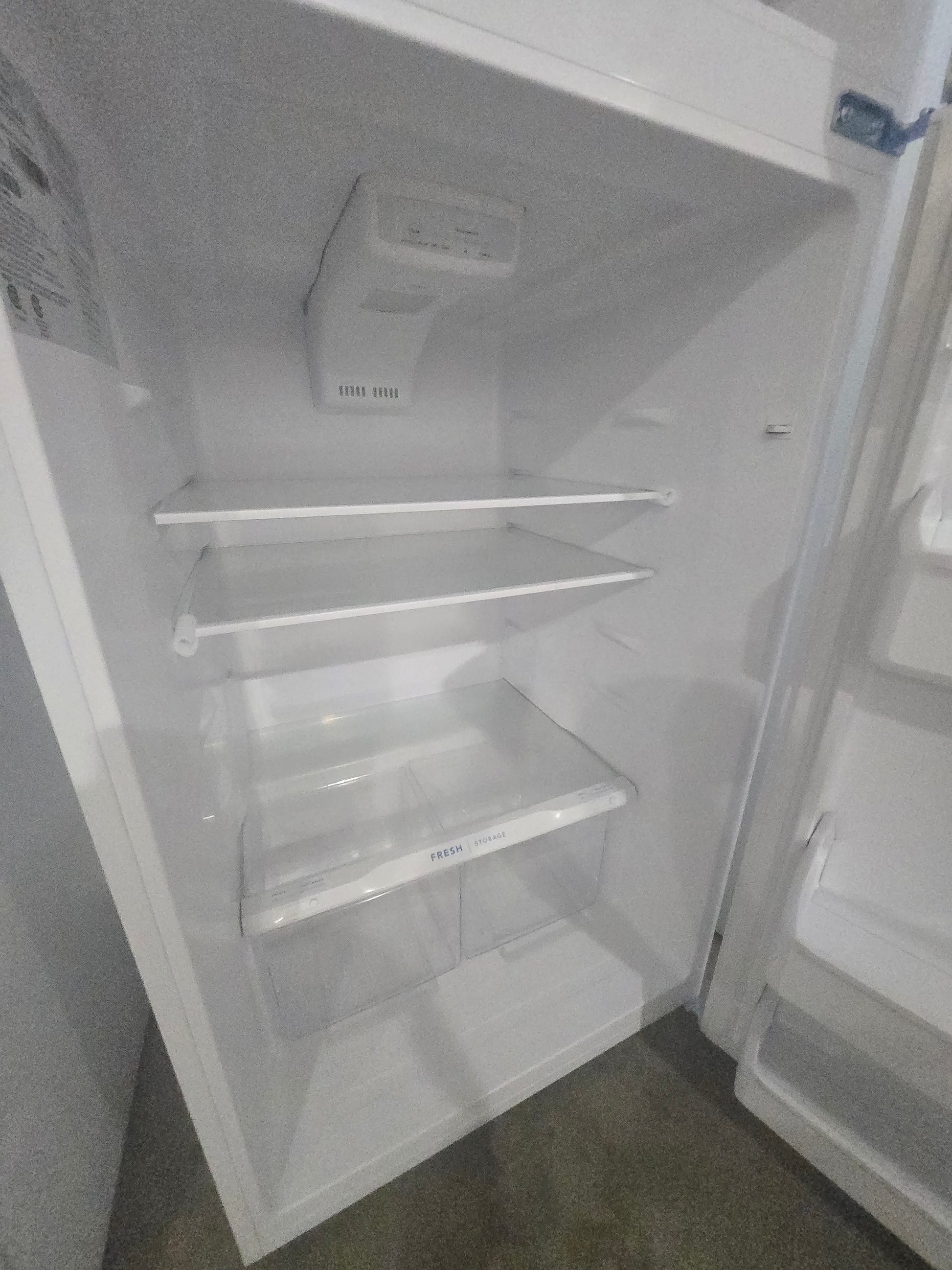 This Frigidaire 18 cubic foot top freezer refrigerator includes spacious interior storage options designed for busy families, including two edge-to-edge glass shelves, gallon door bins, full-width wire freezer shelf, and a dairy bin. Our humidity-controlled crispers keep produce fresh for longer, allowing you to waste less and save money. Additionally, the bright LED lighting makes it easier to see what’s inside.